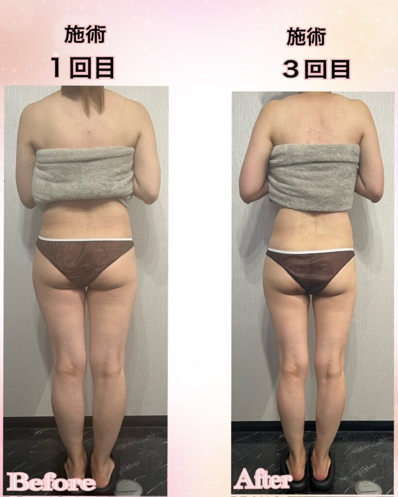 2、3回目でいつも履いているズボンが緩くなって買い替えたほどです。8回目にはむくみが気にならなくなり、写真でも見るからに痩せました!