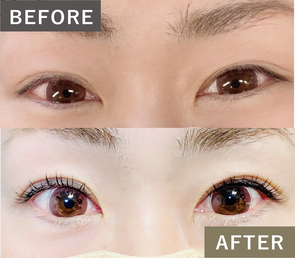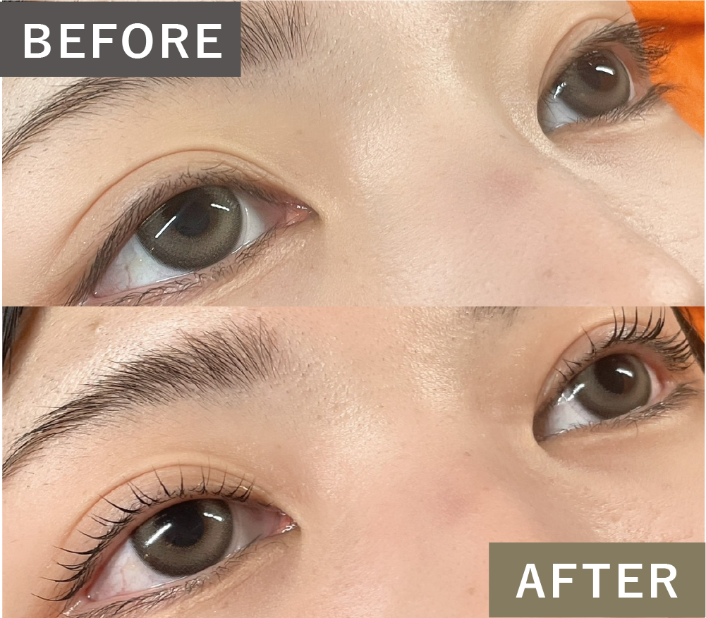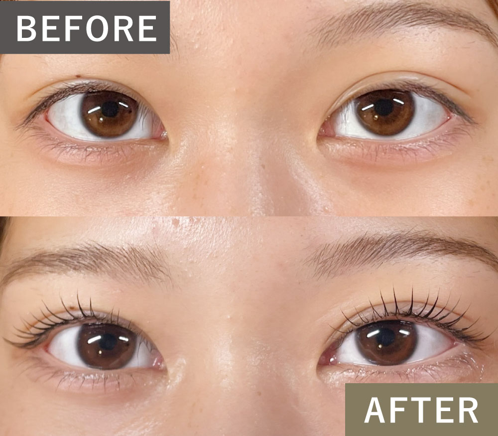 しっかりカールをしたあとにまつ毛の先端にティントで黒を入れることによってマスカラをしているかのような仕上がりになって大喜びされました!